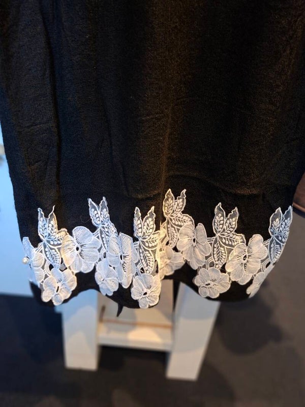 Ook rondom de mouwen zitten de bloemen en de parels.